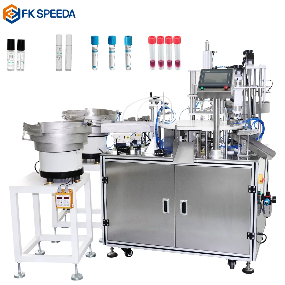 automatic test tube filling Screw capping filling machine is suitable for labeling various small-sized cylindrical and conical products, such as cosmetic round bottles, small bottles, plastic bottles, oral liquid bottle labeling, pen holder labeling, lipstick labeling,and other small round bottles liquid bottle filling, capping and labeling etc. It is widely used in round bottle labeling in food, cosmetics, wine making, beverage, chemical industry and other industries, and can realize semicircular labeling.
